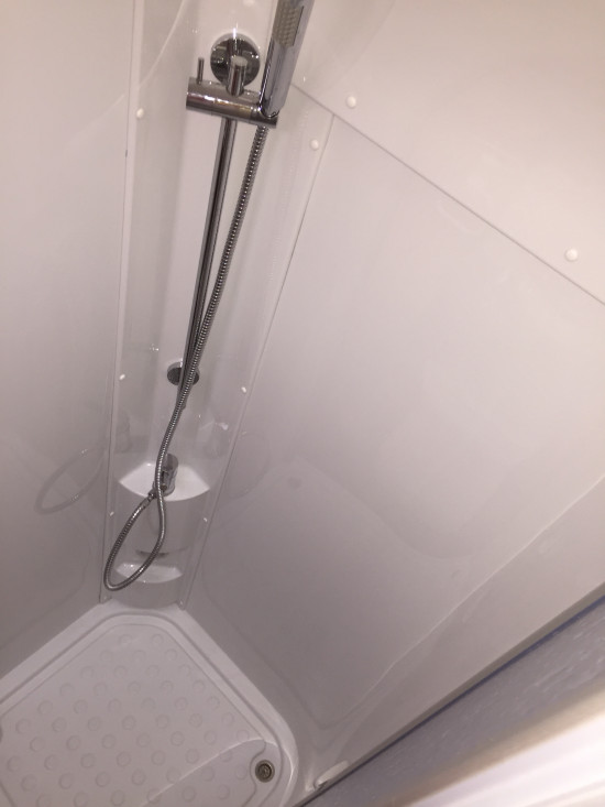 Sanitärraum mit Waschbecken, WC und Dusche